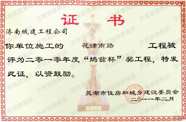 芜湖市商务文化中心新三、四、五大道工程被评为2010年度鸠兹杯奖工程