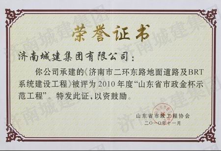 济南市二环东路地面蹊径及BRT系统建设工程被评为2010年度山东省市政金杯树模工程