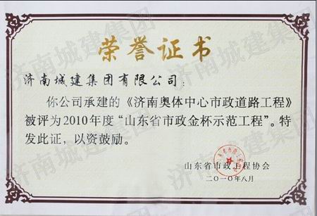 济南奥体中心市政蹊径工程被评为2010年度山东省市政金杯树模工程