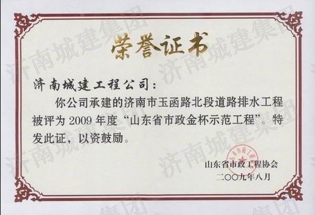 济南市玉函路北段蹊径排水工程被评为2009年度山东省市政金杯树模工程